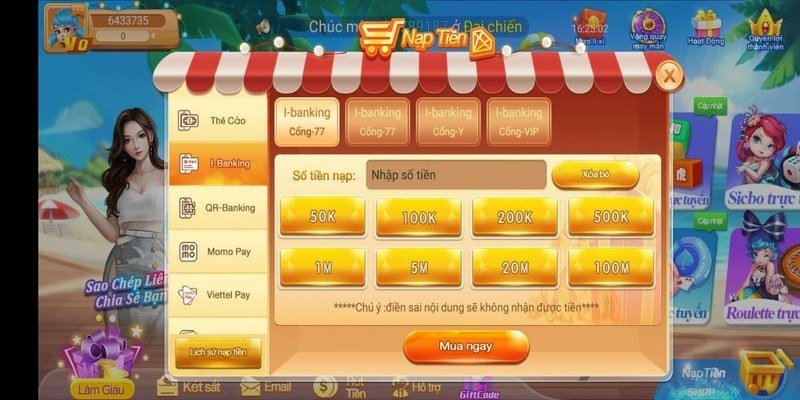 Ngoài ra, các phương thức rút, nạp đa dạng lựa chọn nên bạn không gặp phải tình trạng tắc nghẽn trong quá trình thanh toán. Hiện nay, game thủ có thể sử dụng các hình thức giao dịch sau: